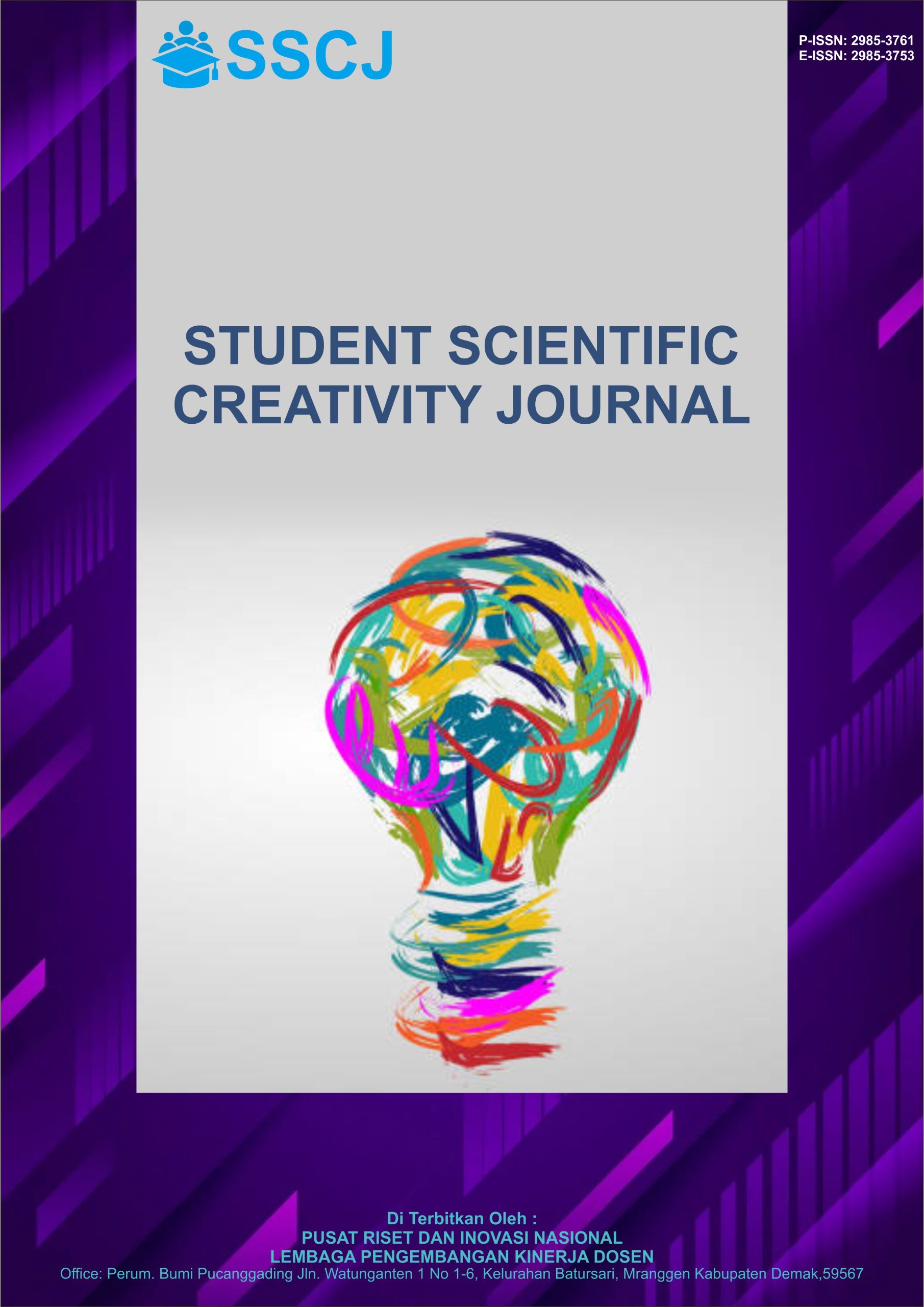 Student Scientific Creativity Journal, merupakan platform publikasi jurnal Karya suatu hasil penelitian orisinil atau tinjauan Pustaka yang ditulis oleh mahasiswa. Ruang lingkup karya yang diterbitkan mencakup Multidisiplin diantaranya yaitu: Ilmu Sosial Humaniora, Pertanian, Kesehatan, Peternakan, perikanan, Politik, Pendidikan, Ilmu Teknik, Teknik Elektro dan Informatika, Desain Komunikasi Visual, Manajemen, Ekonomi dan Akuntansi, Kewirausahaan dan Bisnis. Jurnal ini terbit 1 tahun 6 kali (Januari, Maret, Mei, Juli, September dan November)