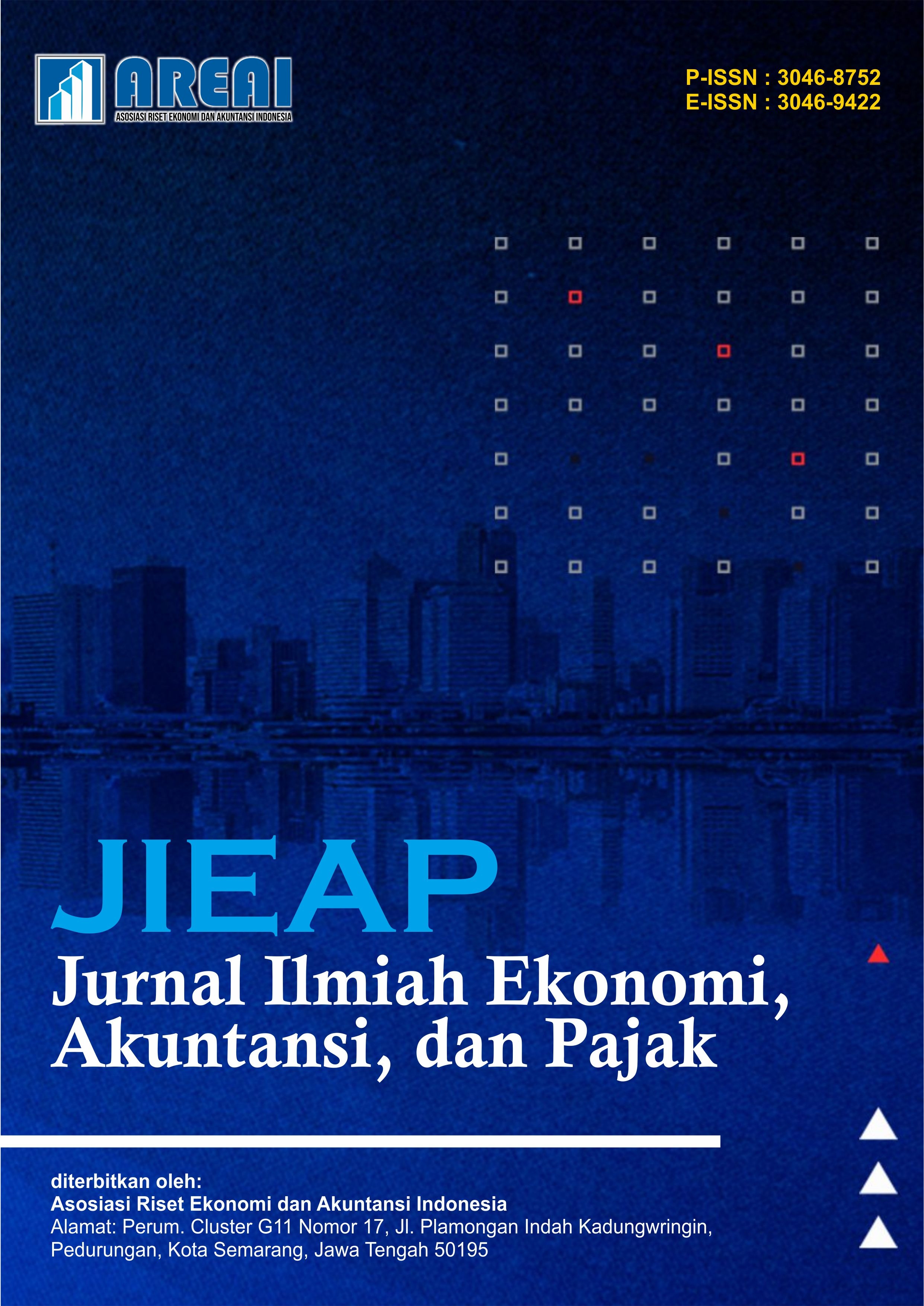 Jurnal Ilmiah Ekonomi, Akuntansi, dan Pajak (JIEAP) Dengan e-ISSN : 3046-9422, p-ISSN : 3046-8752 merupakan jurnal yang dikhususkan untuk publikasi artikel ilmiah yang diterbitkan oleh Asosiasi Riset Ekonomi dan Akuntansi Indonesia. Jurnal ini terbit 4 kali dalam setahun yaitu pada bulan Maret, Juni, September, Desember. Misi Jurnal Ilmiah Ekonomi, Akuntansi, dan Pajak (JIEAP) adalah untuk mendiseminasikan, mengembangkan dan memfasilitasi hasil-hasil penelitian Ilmu Ekonomi,Ilmu Perpajakan dan Akuntansi, sebagai wadah bagi para dosen, guru, peneliti dan praktisi di bidang Ekonomi dan Manajemen dari seluruh Indonesia, dalam melakukan pertukaran informasi mengenai hasil penelitian terbaru yang telah dilakukan.