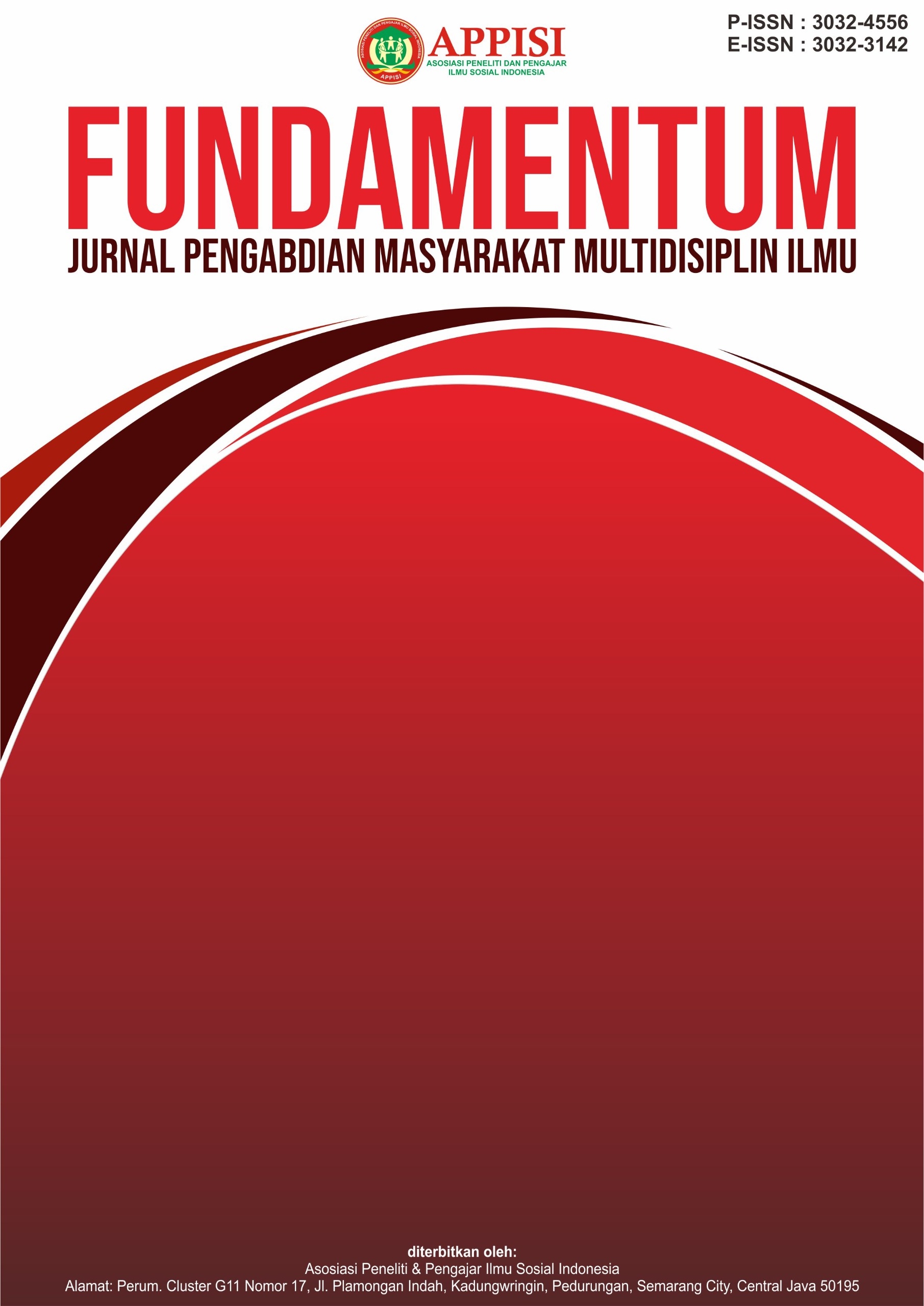 FUNDAMENTUM : Jurnal Pengabdian Multidisiplin is a journal of the results of community service activities that are open access, published by Asosiasi Ilmuwan Pendidikan Sosial dan Humaniora Indonesia (AIPSHI);This journal is a blind and peer-reviewed journal that publishes scientific articles from Community Service (PKM) activities from various disciplines.FUNDAMENTUM accept manuscripts or articles in the field of applied research and community service from various academics and researchers both nationally and internationally. Articles in FUNDAMENTUM is open access which is published three times a year, namely in February, April and June.
