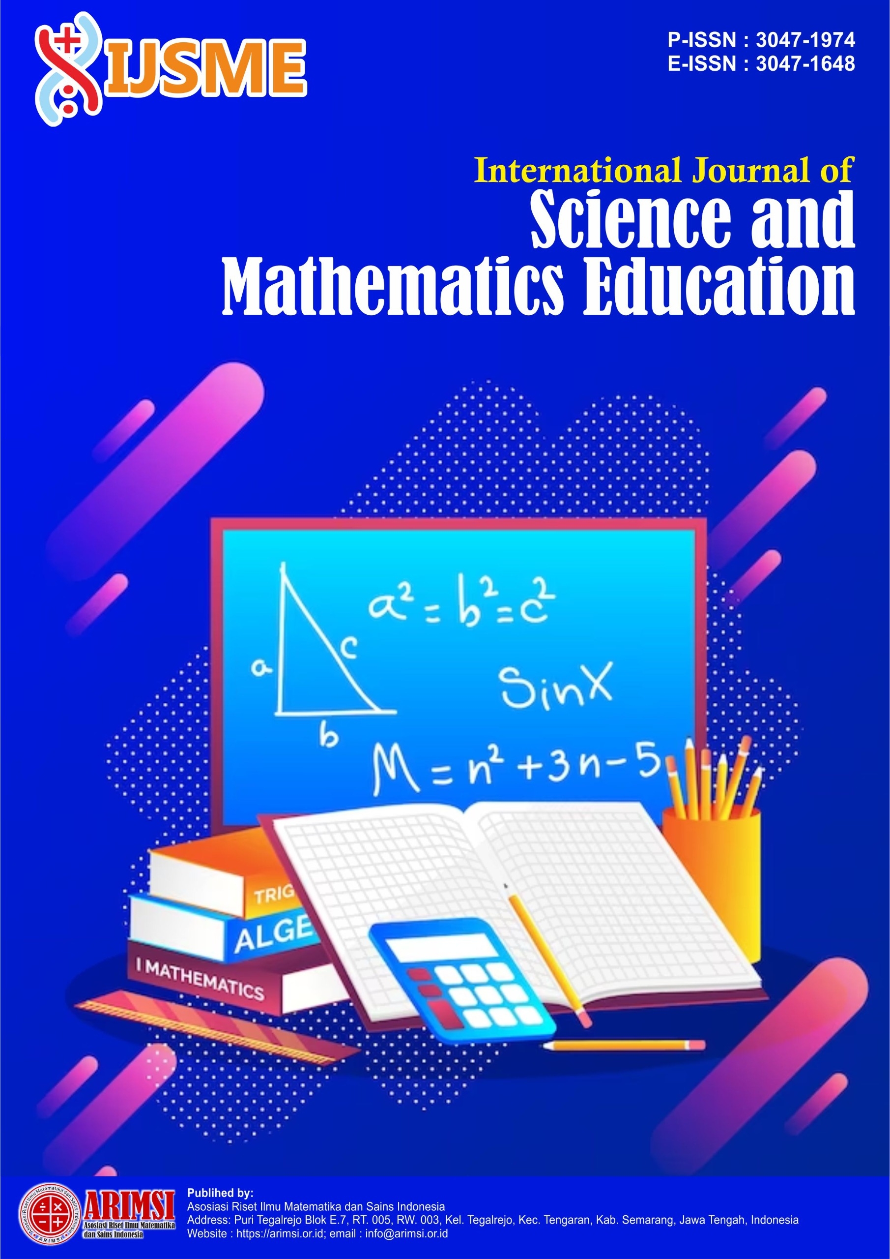 International Journal of Science and Mathematics Education [e-ISSN : 3062-7214, p-ISSN : 3062-7206] is an open access Journal published by the ARIMSI(Asosiasi Riset Ilmu Matematika dan Sains Indonesia). This journal accepts manuscripts based on empirical research results, new scientific literature review, and comments/ criticism of scientific papers published by International Journal of Science and Mathematics Education. This journal is a means of publication and a place to share research and development work in the field of Science and Mathematics Education. Articles published in International Journal of Science and Mathematics Education are processed fully online. Submitted articles will go through peer review by a qualified international Reviewers. Complete information for article submission and other instructions are available in each issue. International Journal of Science and Mathematics Education publishes 4 (four) issues a year in March, June, September, December, however articles that have been declared accep