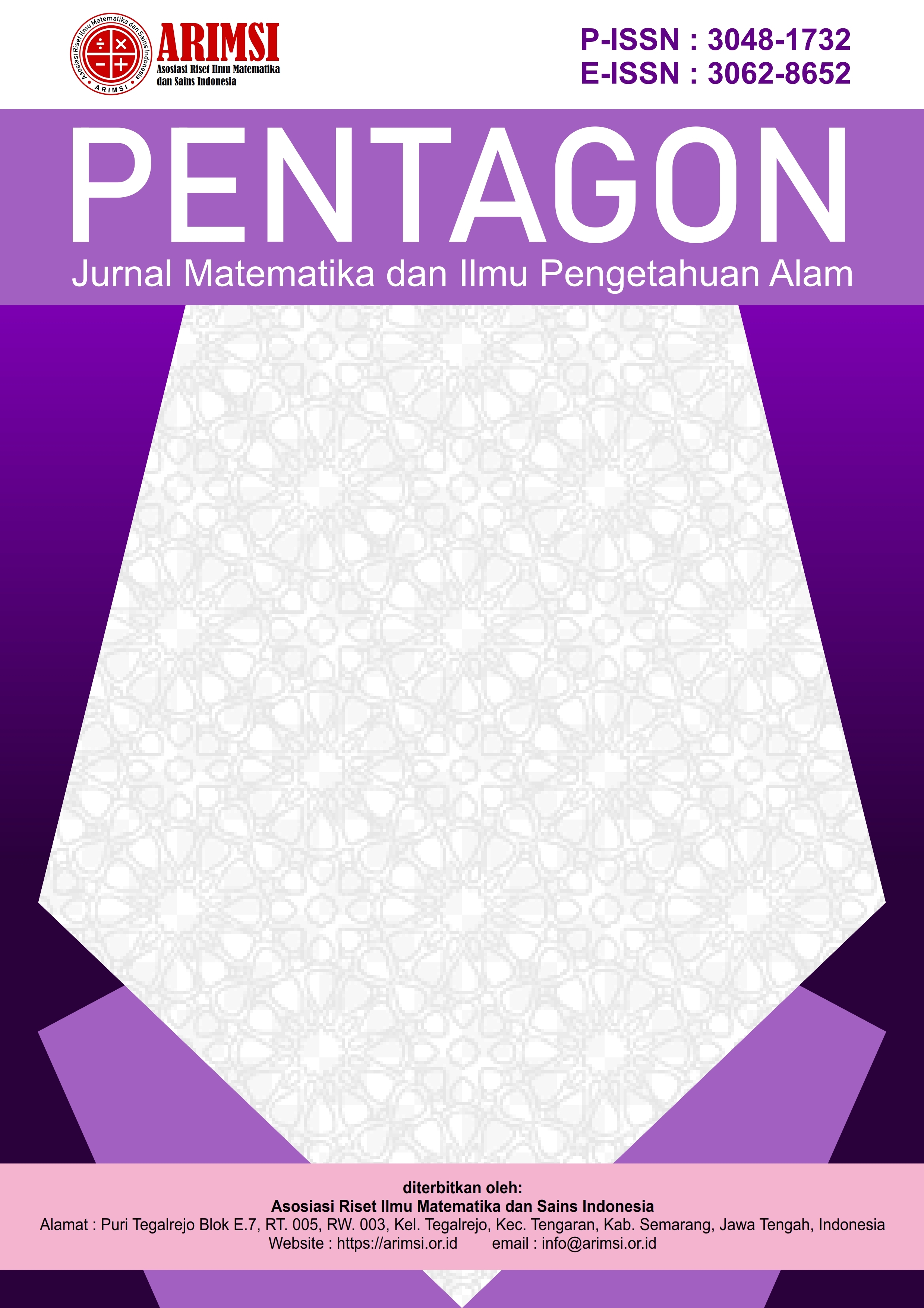 Pentagon : Jurnal Matematika dan Ilmu Pengetahuan Alam adalah jurnal yang ditujukan untuk publikasi artikel ilmiah yang diterbitkan oleh Asosiasi Riset Ilmu Matematika dan Sains Indonesia. Jurnal ini adalah jurnal Matematika dan Ilmu Pengetahuan Alam yang bersifat peer-review dan terbuka. Bidang kajian dalam jurnal ini termasuk sub rumpun Ilmu Matematika, dan Ilmu IPA. Pentagon : Jurnal Matematika dan Ilmu Pengetahuan Alam menerima artikel dalam bahasa Inggris dan bahasa Indonesia dan diterbitkan 1 tahun 4 kali (Maret, Juni, September dan Desember).