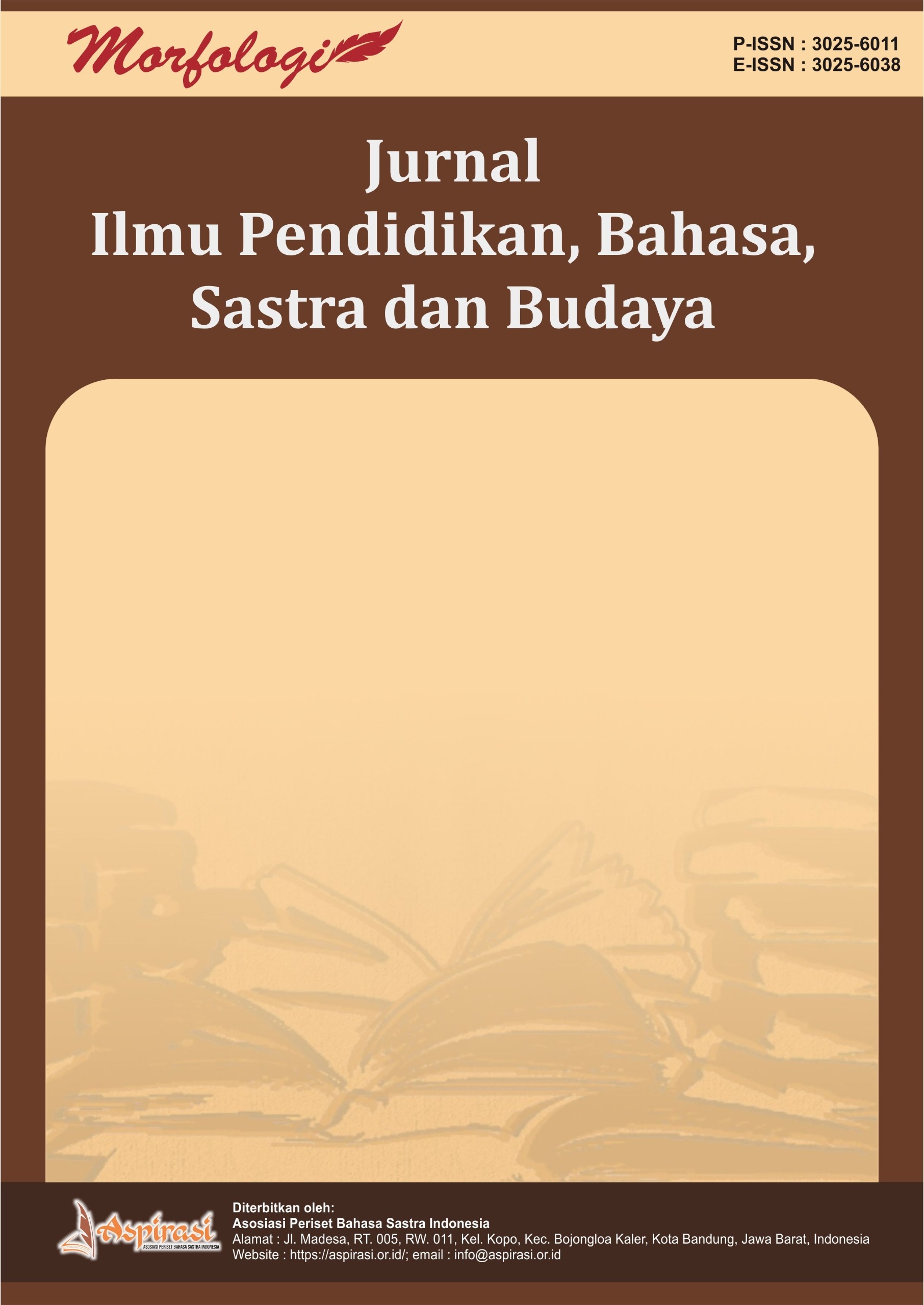 Morfologi : Jurnal Ilmu Pendidikan, Bahasa, Sastra dan Budaya is a journal devoted to the publication of scientific articles published by Asosiasi Periset Bahasa Sastra Indonesia. Jurnal ini adalah Journal of Education, Language, Literature and Culture which is peer-reviewed and open. The fields of study in this journal include the Education, Language, Literature and Culture sub-groups. Morfologi : Jurnal Ilmu Pendidikan, Bahasa, Sastra dan Budaya accept articles in English and Indonesian and published 1 year 6 times (February, April, June, August, October and December). Morfologi: Jurnal Ilmu Pendidikan, Bahasa, Sastra, dan Budaya merupakan jurnal ilmiah yang mempublikasikan hasil penelitian dan kajian ilmiah di bidang: Pendidikan Kurikulum dan pembelajaran Inovasi dan teknologi dalam pendidikan Evaluasi dan asesmen pendidikan Pengembangan profesionalisme pendidik Pendidikan inklusif dan multikultural Bahasa Linguistik teoretis dan terapan Psikolinguistik dan sosiolinguistik Analisis wacana dan pragmatik Pengajaran dan pemerolehan bahasa Penerjemahan dan kajian leksikografi Sastra Kajian sastra klasik dan modern Sastra bandingan Kritik sastra dan teori sastra Sastra digital dan media baru Sastra dalam pendidikan Budaya Kajian antropologi budaya Tradisi lisan dan folklor Identitas dan representasi budaya Media, komunikasi, dan budaya populer Globalisasi dan perubahan budaya