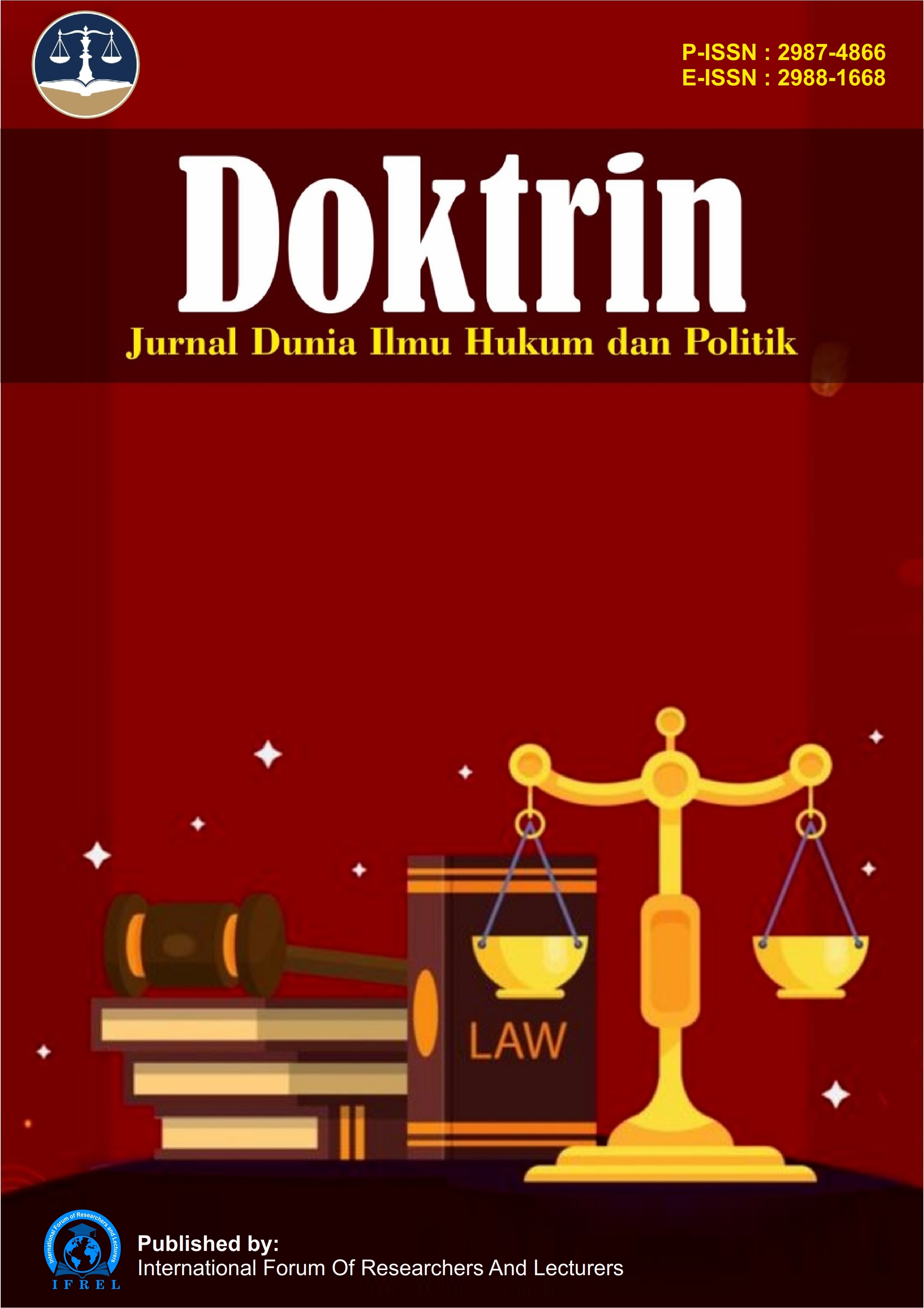 Doktrin: Jurnal Dunia Ilmu Hukum dan Politik dengan e-ISSN : 2988-1668, p-ISSN : 2987-4866 adalah jurnal yang ditujukan untuk publikasi artikel ilmiah yang diterbitkan oleh International Forum of Researchers and Lecturers. Jurnal ini memuat kajian-kajian di bidang ilmu hukum dan Sosial Politik baik secara teoritik maupun empirik. Fokus jurnal ini tentang kajian-kajian hukum perdata, hukum pidana, hukum tata negara, hukum internasional, hukum acara dan hukum adat, politik dan ilmu sosial. Jurnal ini diterbitkan 4 kali setahun (Januari, April, Juli dan Oktober).